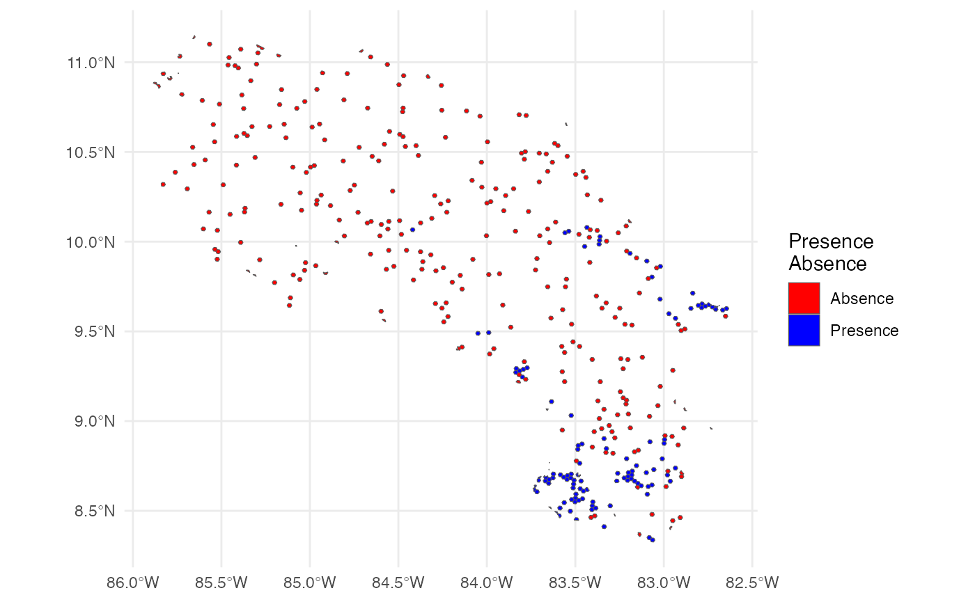 Here we obtain presence–absence data for the species of interest (Silverstoneia flotator). We use the h3sdm_pa function to generate both presence and pseudo-absence records. A limit of 10,000 records is set to ensure that all presence records are retrieved, and 300 pseudo-absences are generated.