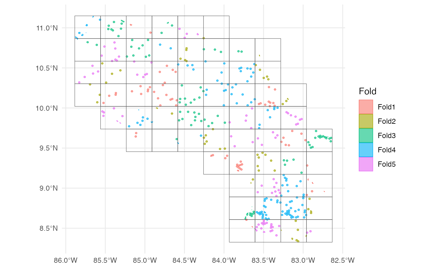 Next, we fit the model using the spatial cross-validation scheme. Spatial CV accounts for spatial autocorrelation by partitioning the data into spatially distinct folds, providing a more realistic assessment of model performance compared to random CV.