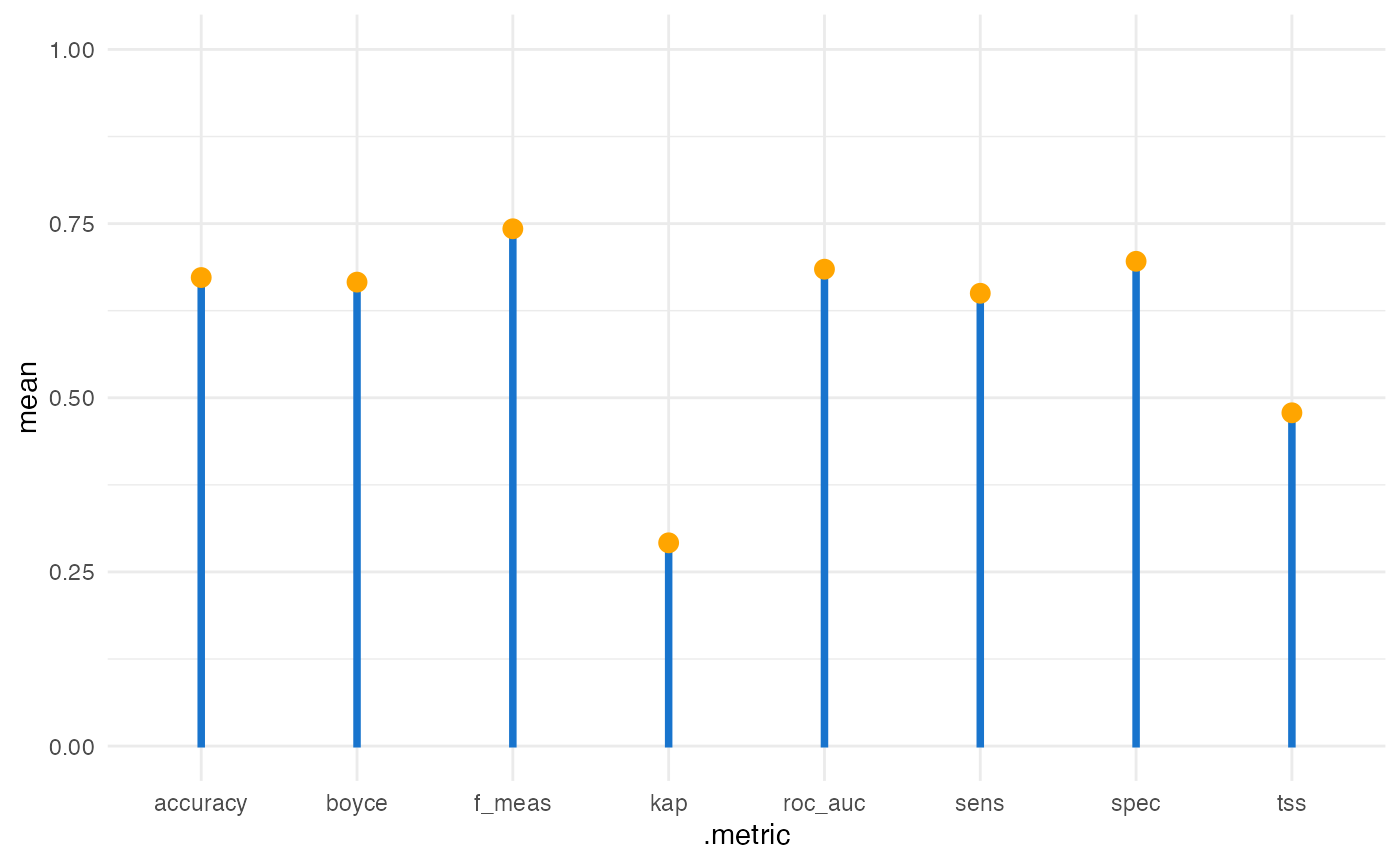 After fitting the model, assess its performance using cross-validated metrics such as ROC-AUC, accuracy, TSS, and the Boyce index. The h3sdm_eval_metrics() function computes these metrics based on the fitted model and the presence data, providing a quantitative measure of how well the model distinguishes presence from absence across spatial folds.