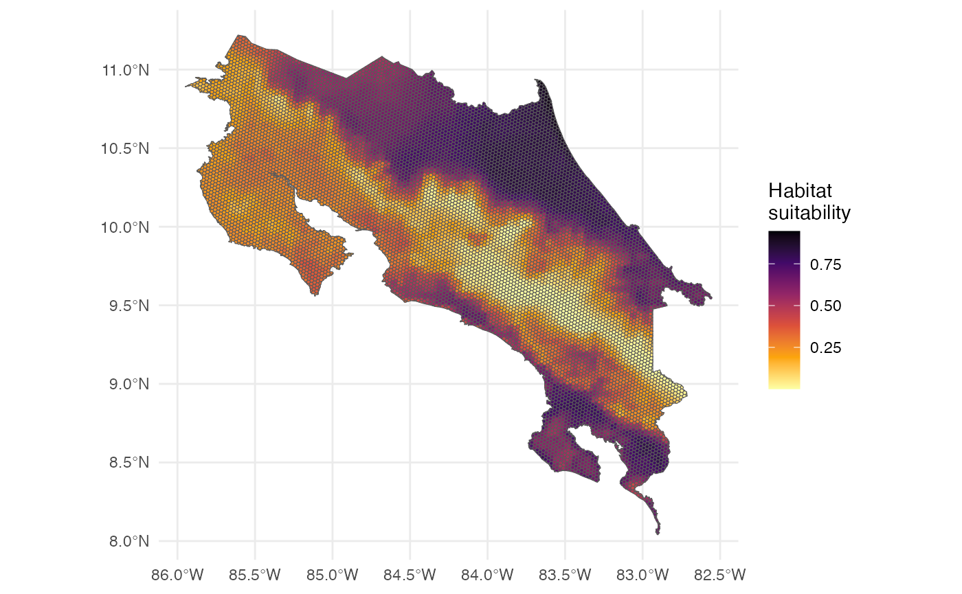 The map represents habitat suitability for the species across the hexagons. The values (usually between 0 and 1 for a logistic model) indicate the habitat suitability of each hexagon for the species.