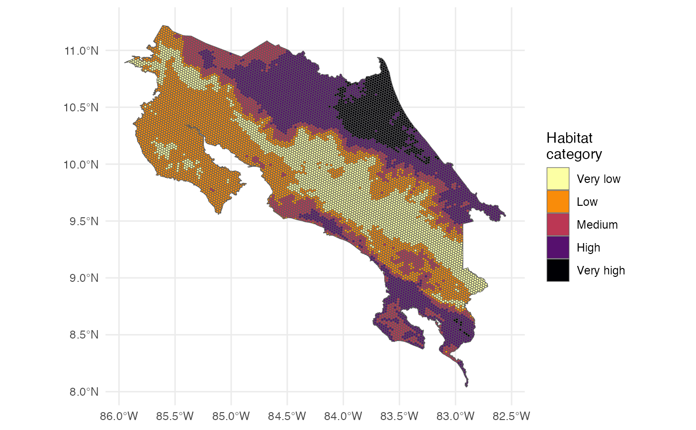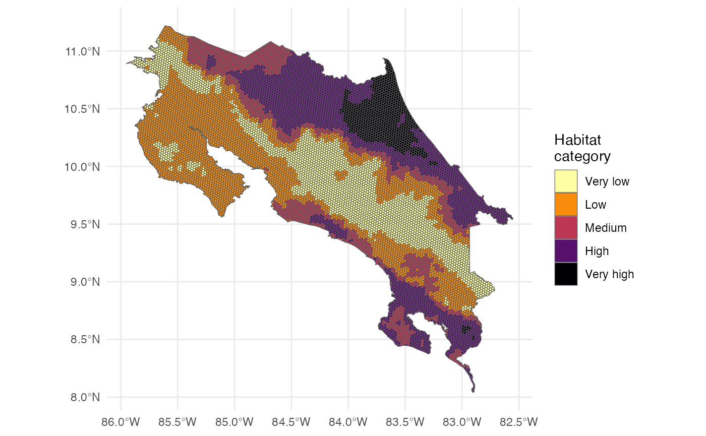 We can categorize the continuous habitat suitability predictions into discrete classes for easier interpretation. Here we define five categories: “Very low”, “Low”, “Medium”, “High”, and “Very high”.