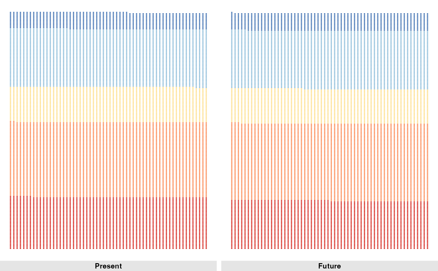 Now we can create a waffle plot to visualize the distribution of habitat suitability categories for both present and future scenarios.