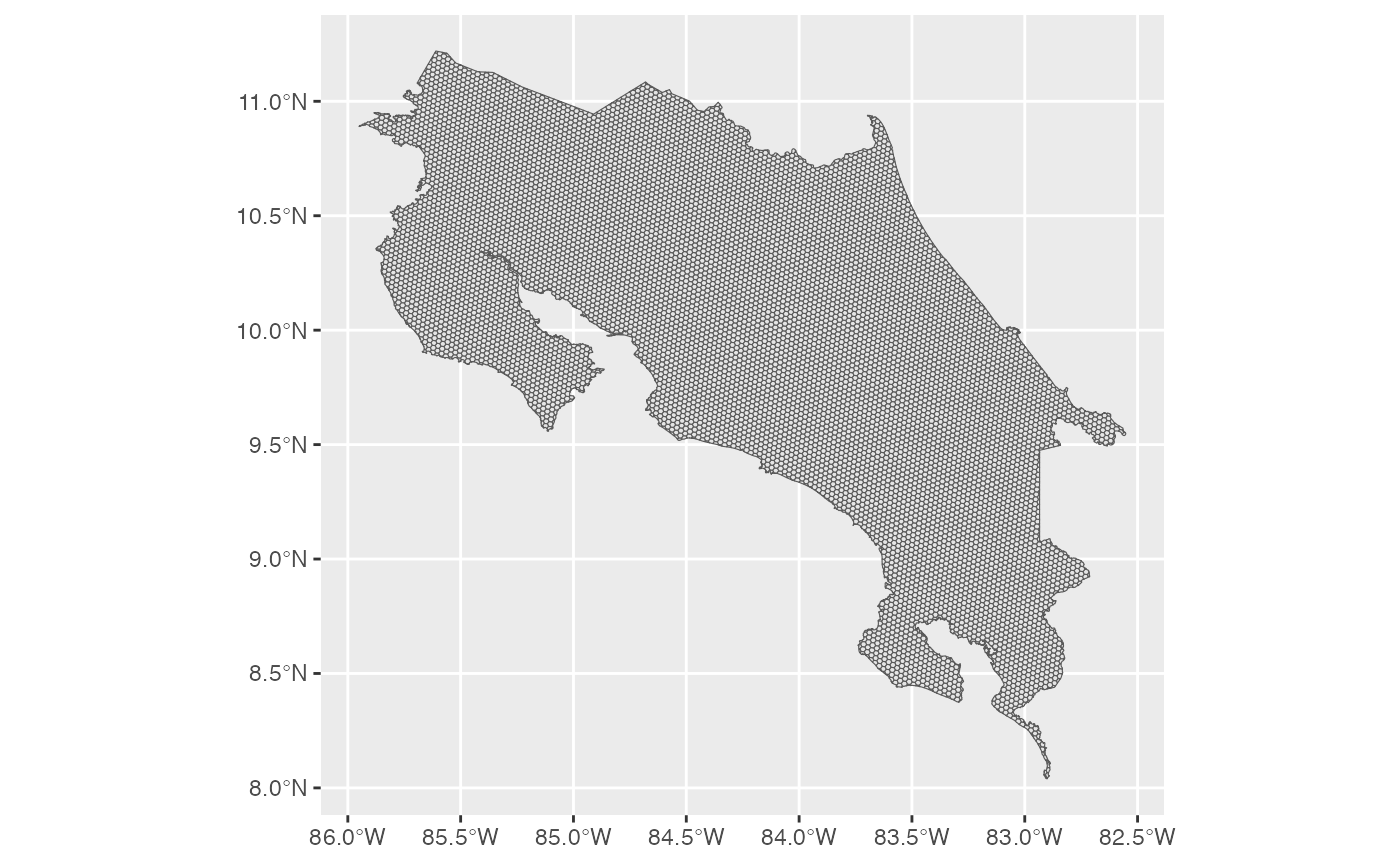 We start by defining the geographical area for modeling. Here we use Costa Rica as an example. The file is includesd in the ‘h3sdm’ package.