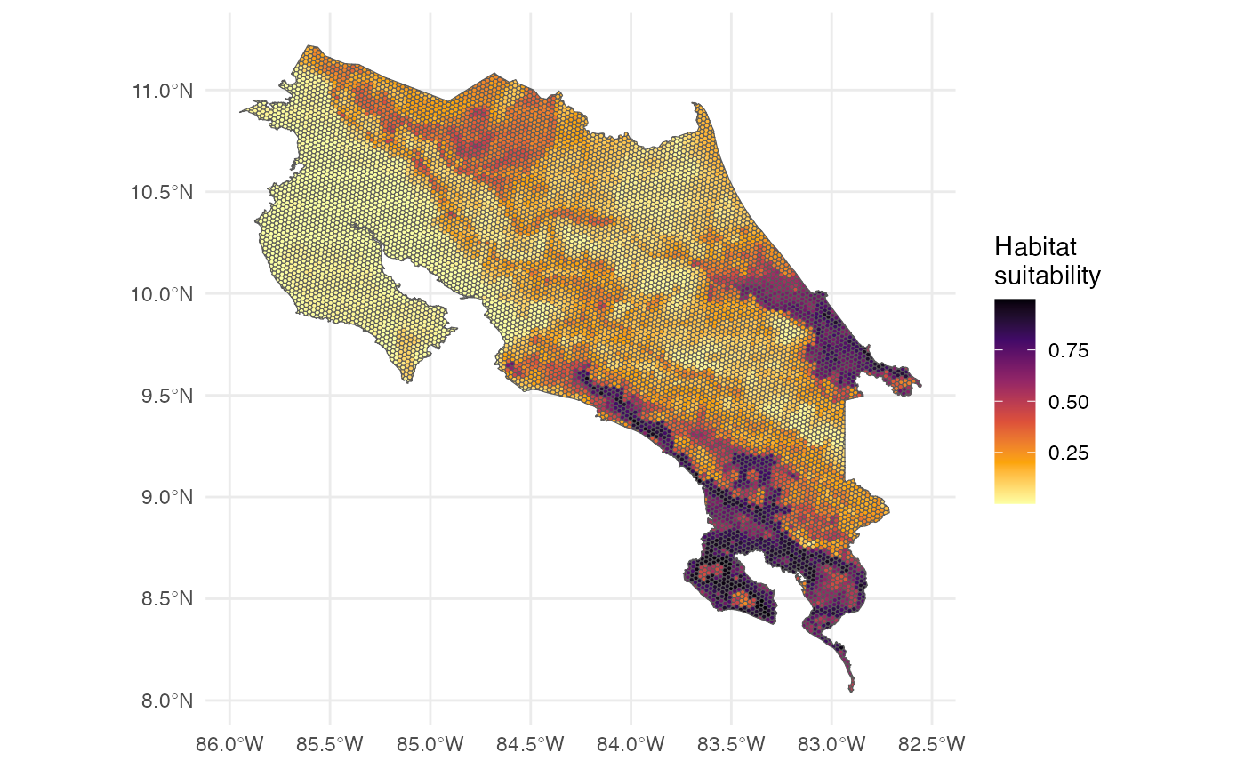 scale_fill_viridis_c(name = "Habitat \nsuitability",option = "B", direction = -1)