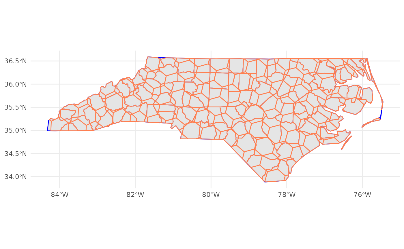 geom_sf(data = nc, color = "blue", linewidth = 0.5) +